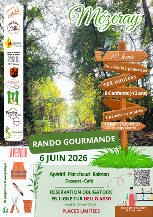 Randonnée gourmande Mézeray Une randonnée gourmande semi-nocturne est organisée, le samedi 6 juin 2026, par un collectif d’associations de Mézeray avec le soutien de la municipalité de la ville. Balade bucolique de 10 km (…)