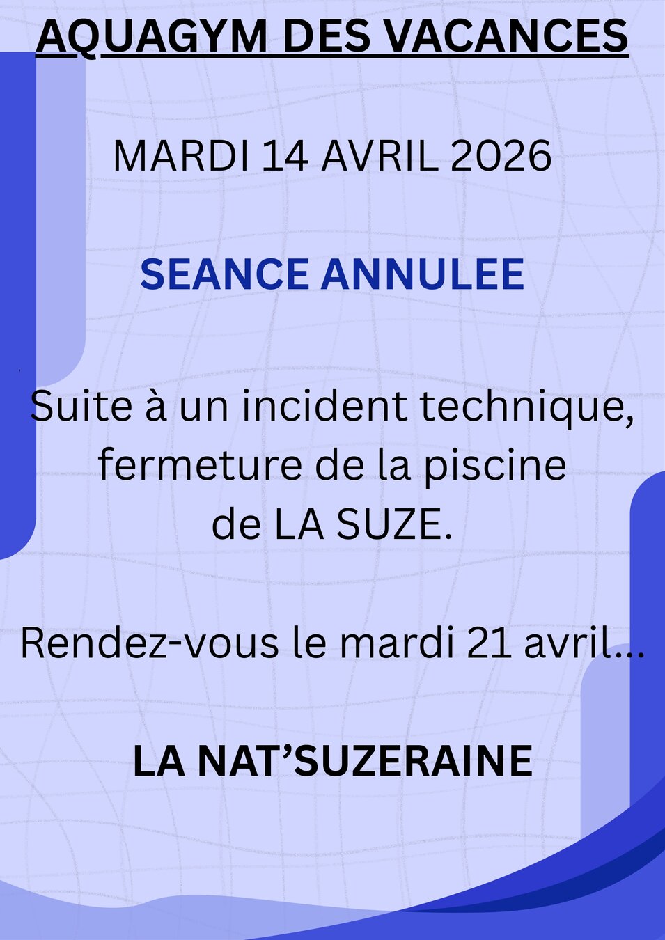 Par conséquent la séance d’aquagym programmée le mardi 14 avril à 20 h 30 est annulée